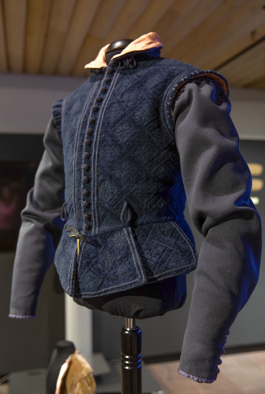 One example of a copy and reconstruction is the so-called 'imitation velvet' on a man's jacket. The men's doublet was usually made of silk velvet, but a cheaper copy was made of velvet of wool and linen. Interestingly, the patterns imitating those in patterned velvet were printed on the fabric with a hot iron, not by weaving!