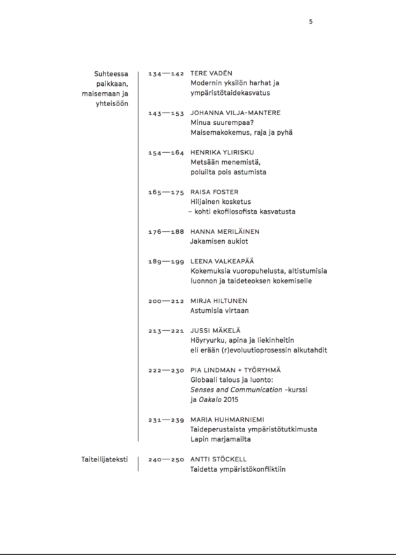 Kirja käsittelee taidetta ja taidekasvatusta suhteessa inhimilliseen ympäristökokemukseen. Erilaisia tekstejä yhdistää osallistava, voimauttava ja aktivismiin orientoitunut pedagoginen asenne, joka haastaa totuttuja asenteita ja käytäntöjä. Artikkelit rakentavat historiallista ja pedagogista perustaa ja ehdottavat avauksia taidekasvatukselle, joka pyrkii edistämään ekososiaalista demokraattisuutta.